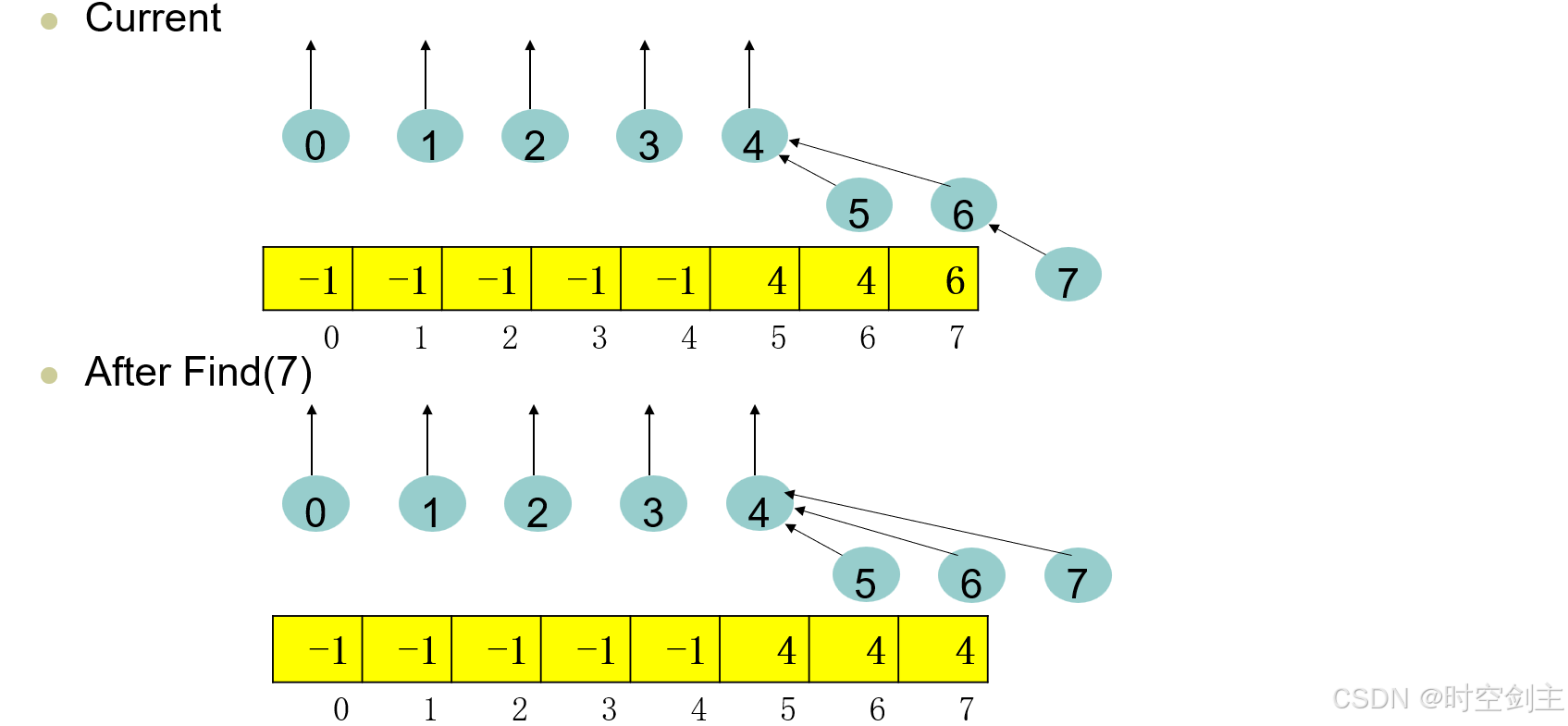在进行查找find的时候,就会进行路径压缩,即在查找过程中对代表元进行更新,直接指向一开始的代表元,即递归边界