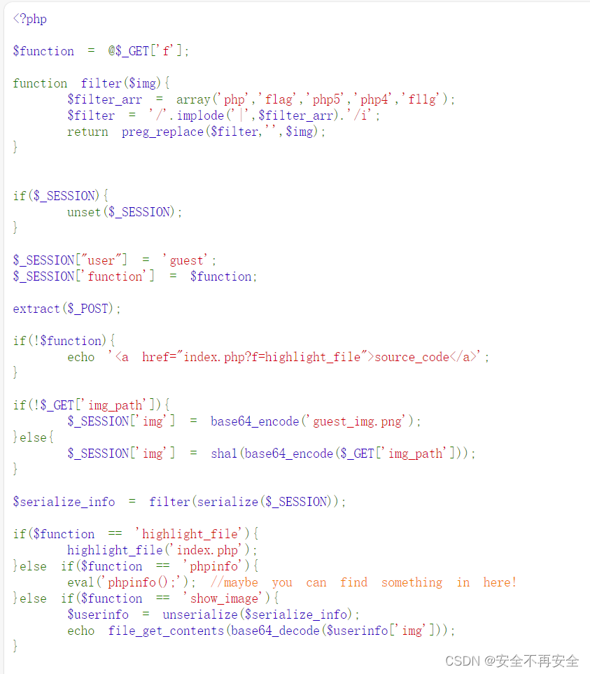 如果 f=show_image ,那么就会对前面序列化的字符串进行反序列化,然后再进过一次 base64 解码,高亮解码后的文件