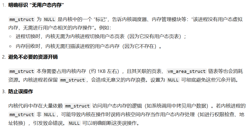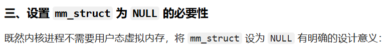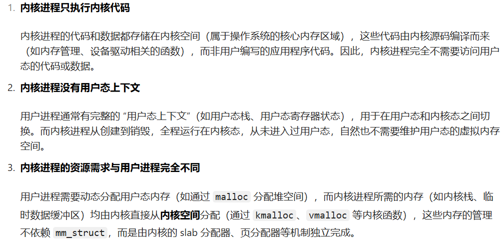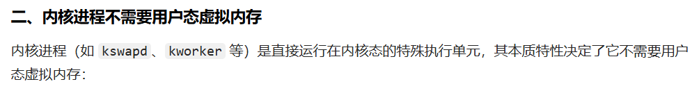 task_struct中的mm_struct字段为NULL(没有用户态虚拟内存空间),仅使用内核空间的虚拟内存。- 全程运行在内核态,执行内核代码(如内存回收、磁盘缓存刷新、处理硬件中断等系统任务)。