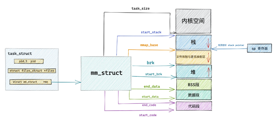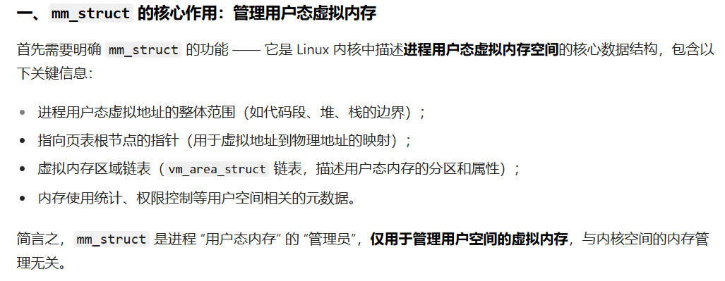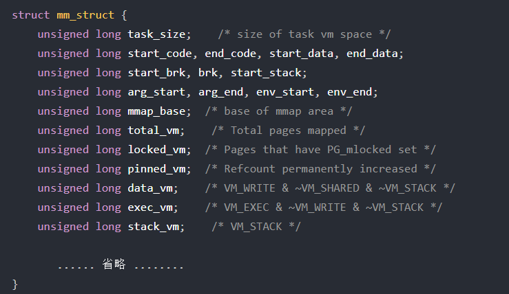 mm_struct是task_struct中专门描述进程虚拟内存空间的内存描述符。