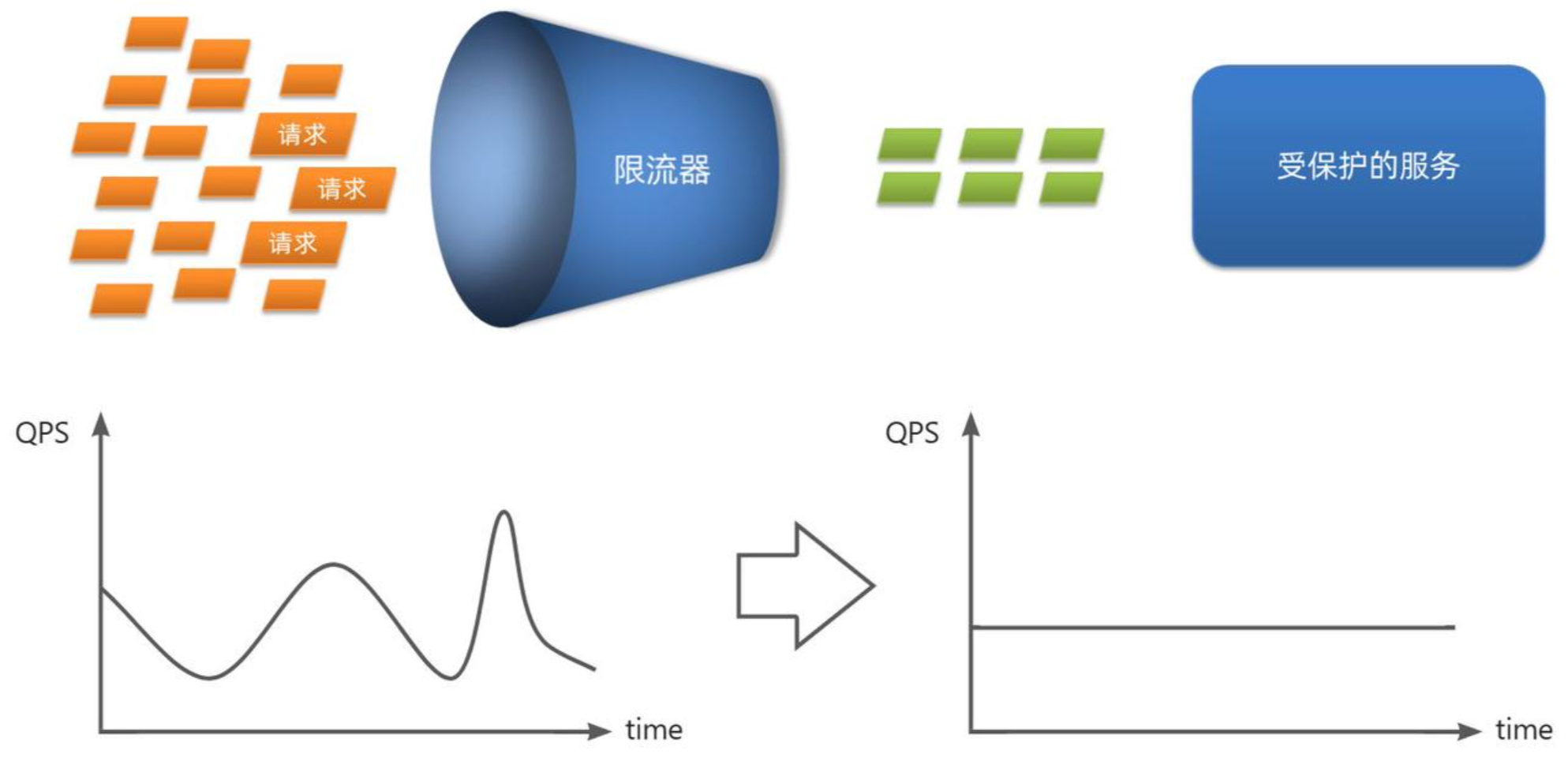 请求限流往往会有一个限流器,数量高低起伏的并发请求曲线,经过限流器就变的非常平稳。这就像是水电站的大坝,起到蓄水的作用,可以通过开关控制水流出的大小,让下游水流始终维持在一个平稳的量。