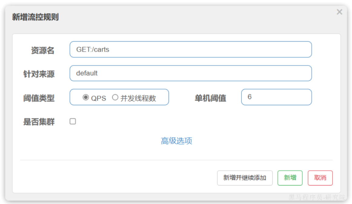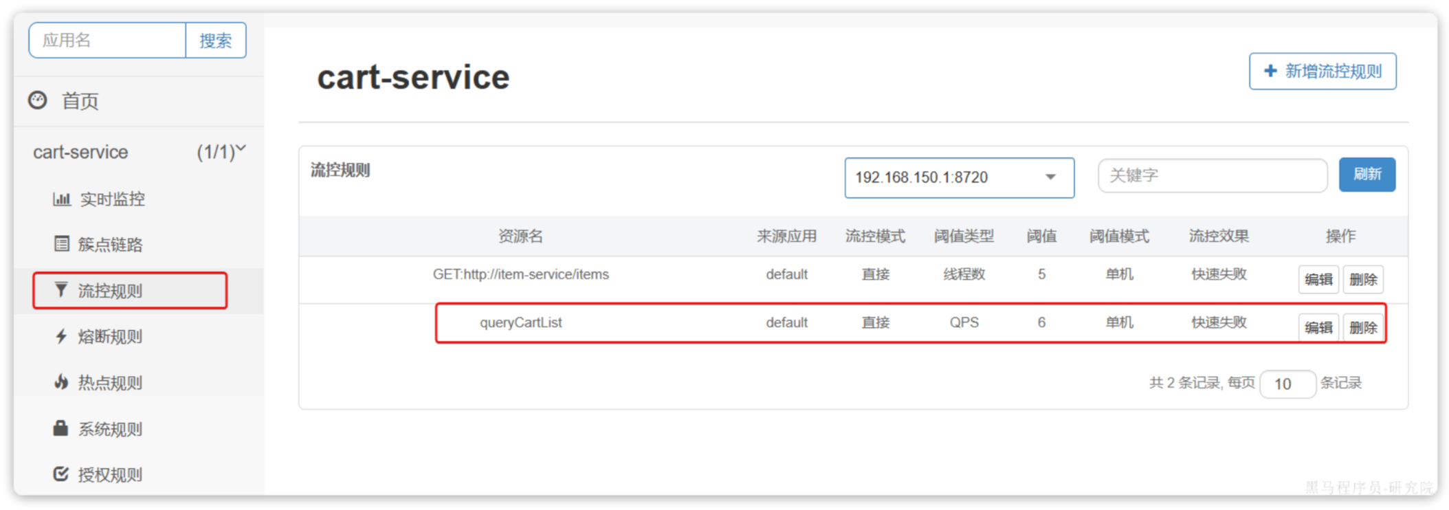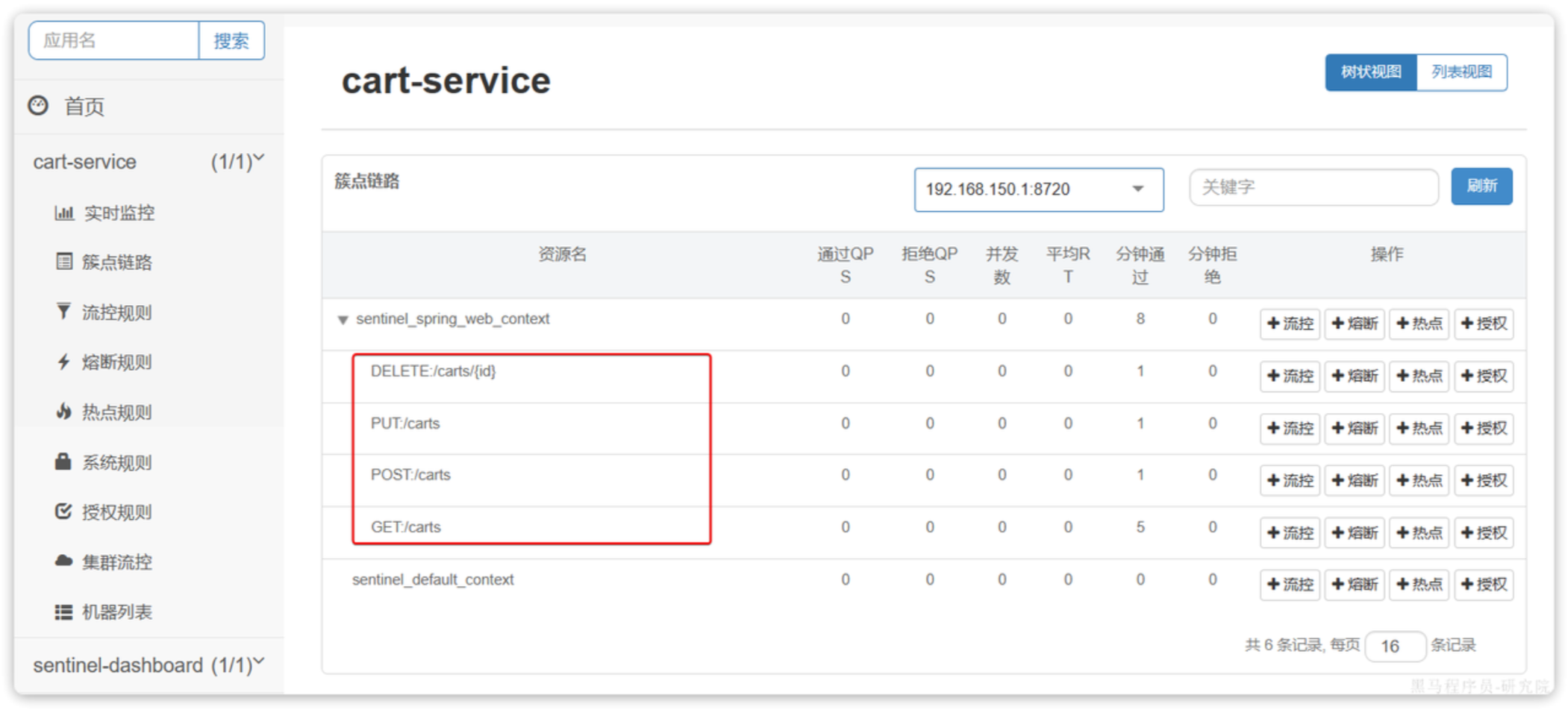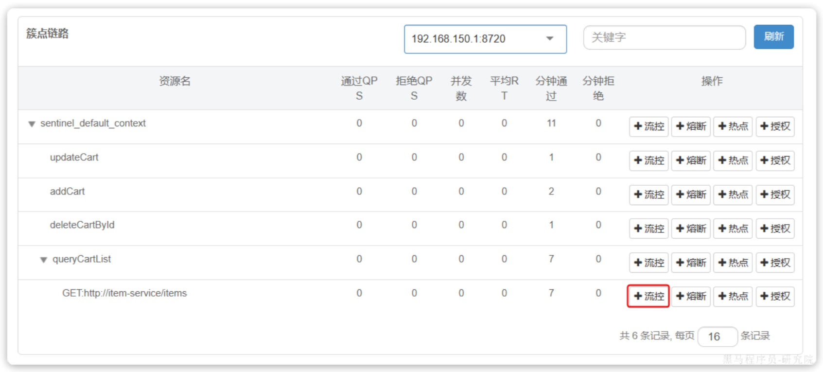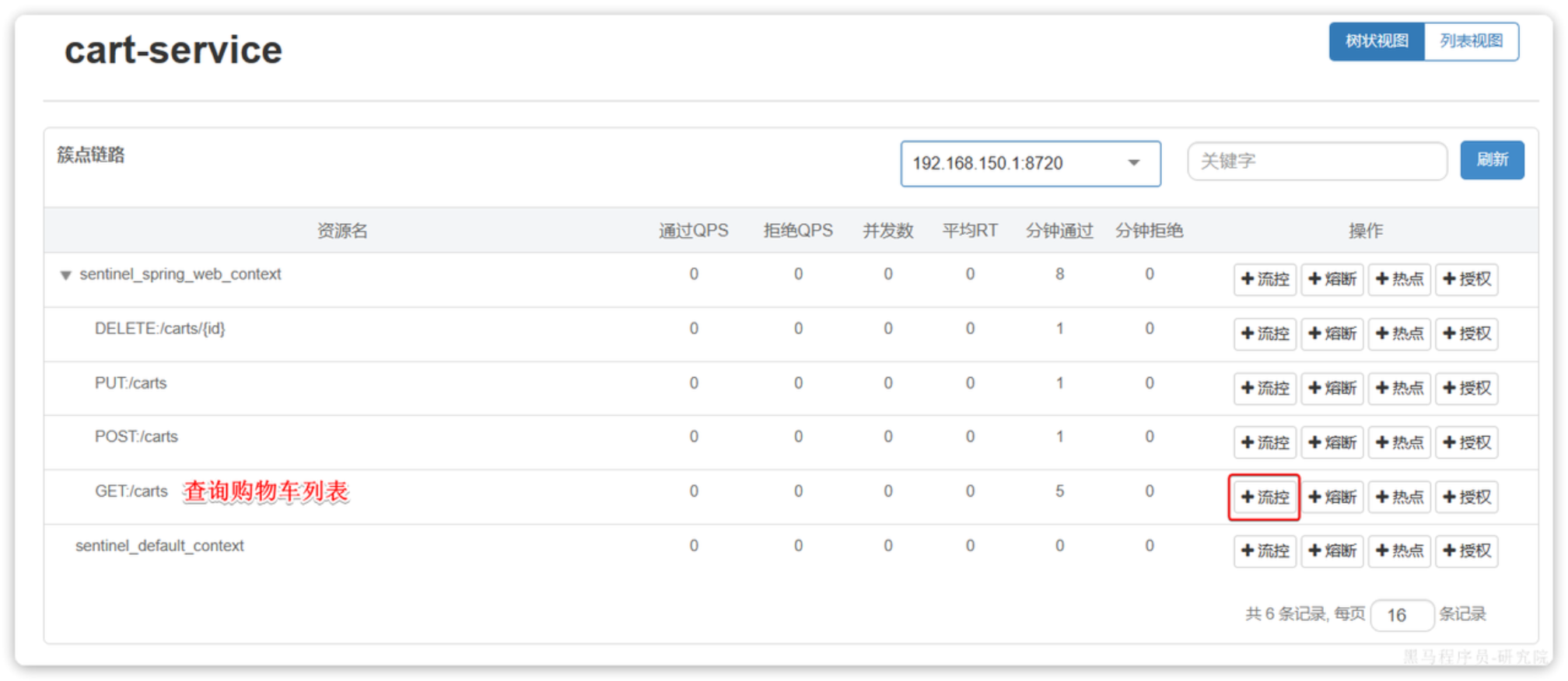这样就把查询购物车列表这个簇点资源的流量限制在了每秒6个,也就是最大QPS为6.