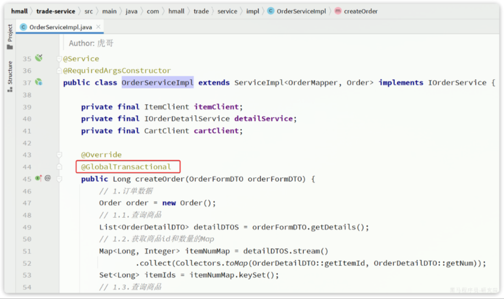 我们找到trade-service模块下的com.hmall.trade.service.impl.OrderServiceImpl类中的createOrder方法,也就是下单业务方法。