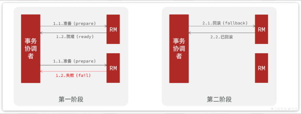 如果一阶段任意一个参与者失败,则通知所有事务参与者回滚事务