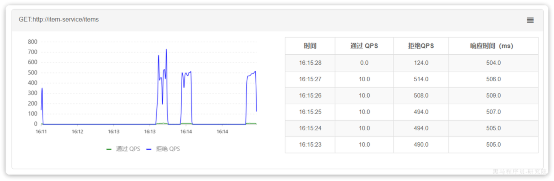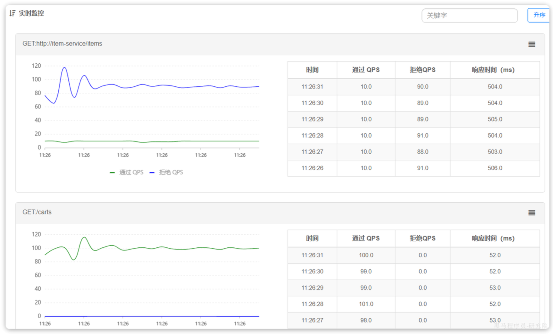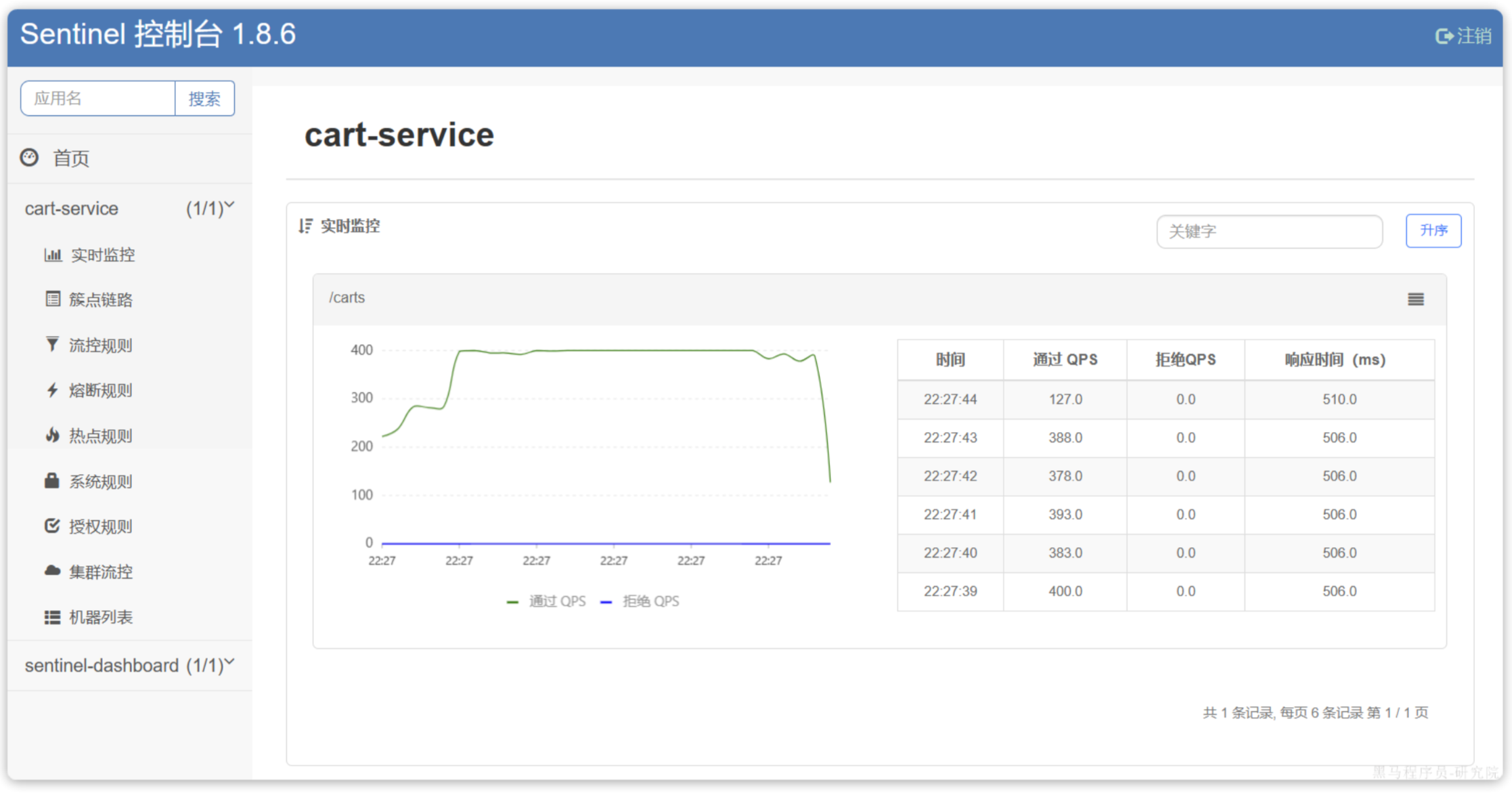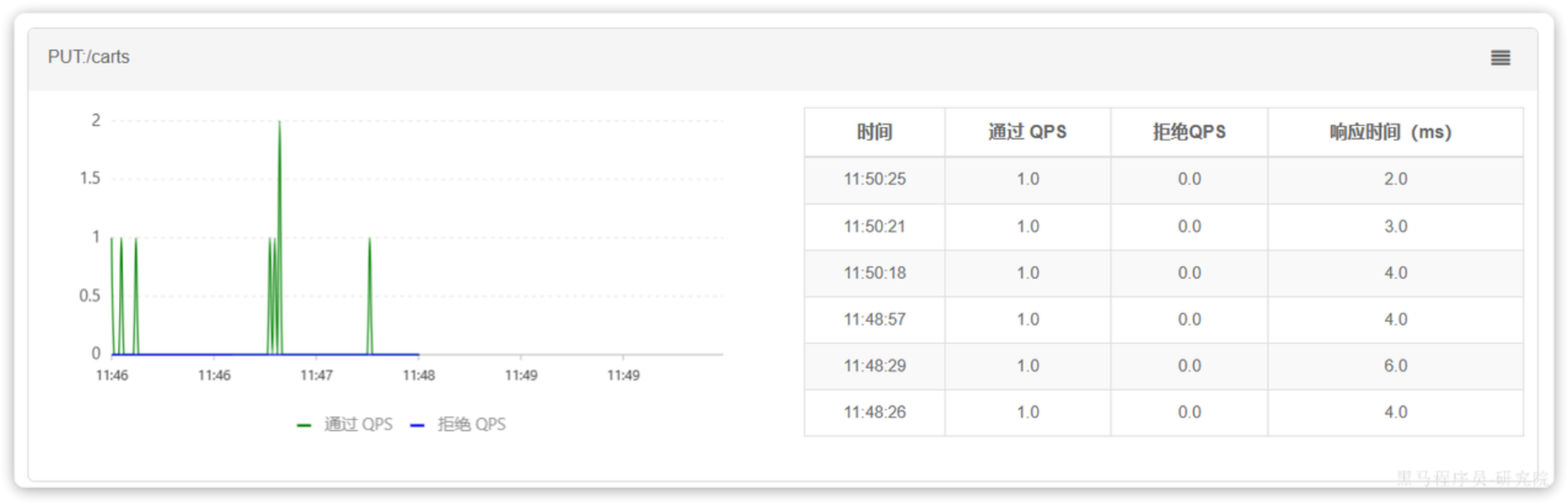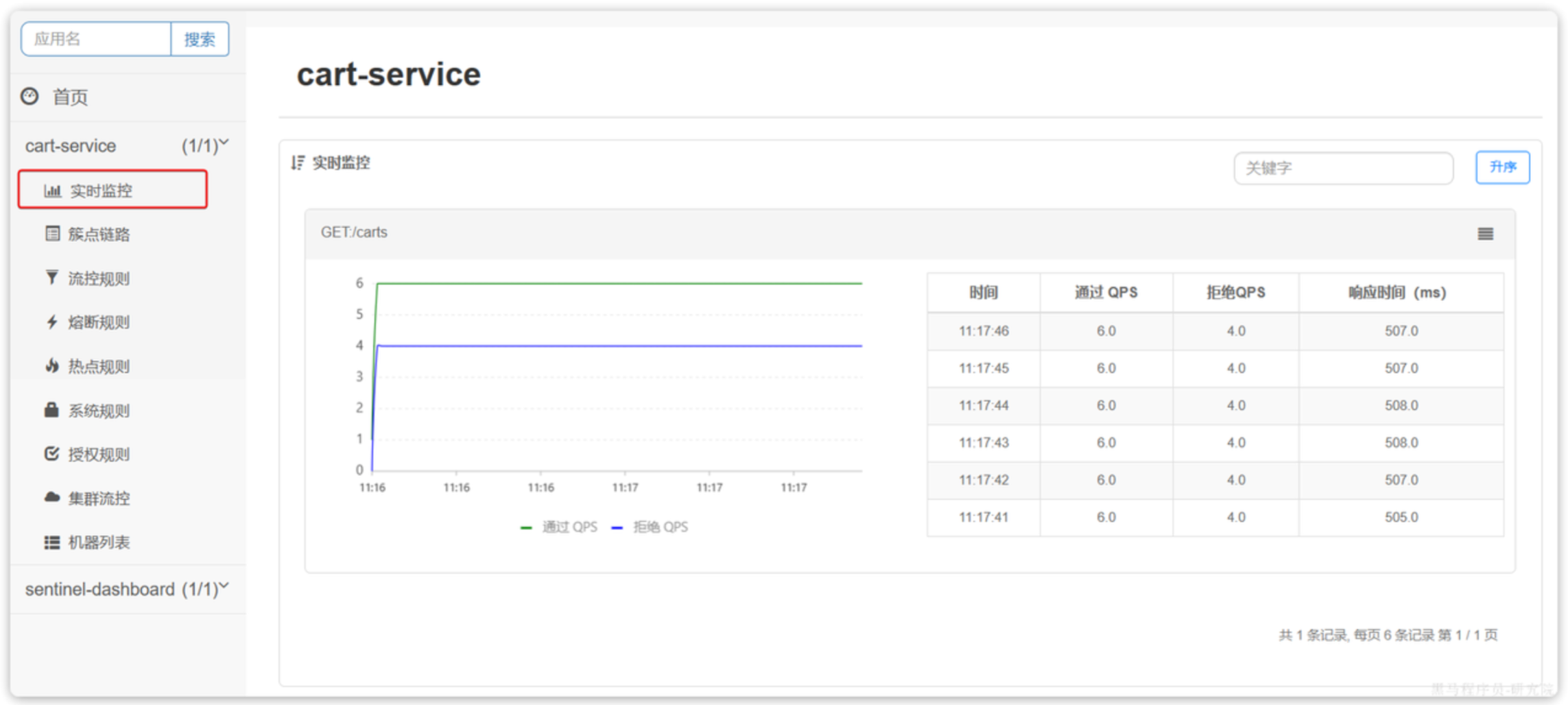 可以看出GET:/carts这个接口的通过QPS稳定在6附近,而拒绝的QPS在4附近,符合我们的预期。