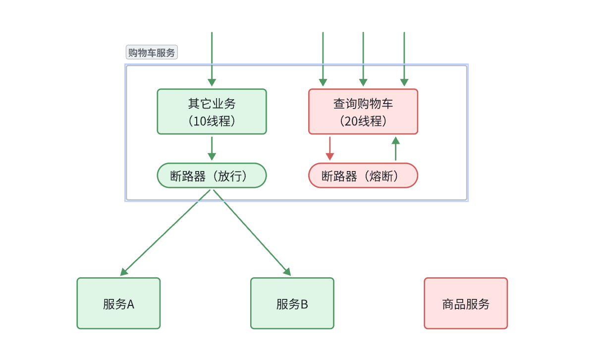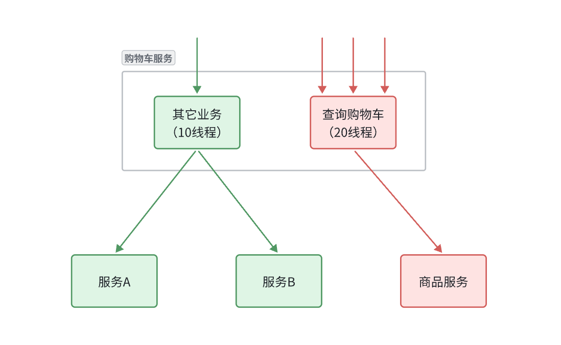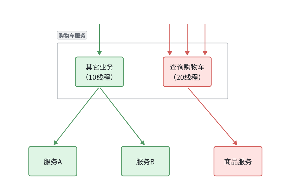 这样,即便商品服务出现故障,最多导致查询购物车业务故障,并且可用的线程资源也被限定在一定范围,不会导致整个购物车服务崩溃。