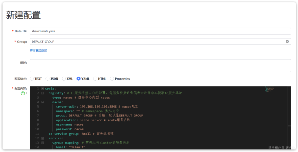 首先,我们要在配置文件中指定要采用的分布式事务模式。我们可以在Nacos中的共享shared-seata.yaml配置文件中设置: