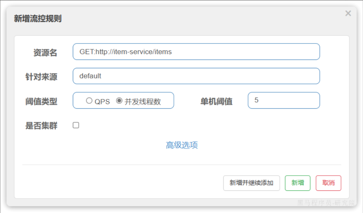 在簇点链路后面点击流控按钮,即可对其做限流配置: