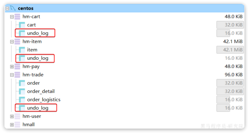 将课前资料的seata-at.sql分别文件导入hm-trade、hm-cart、hm-item三个数据库中: