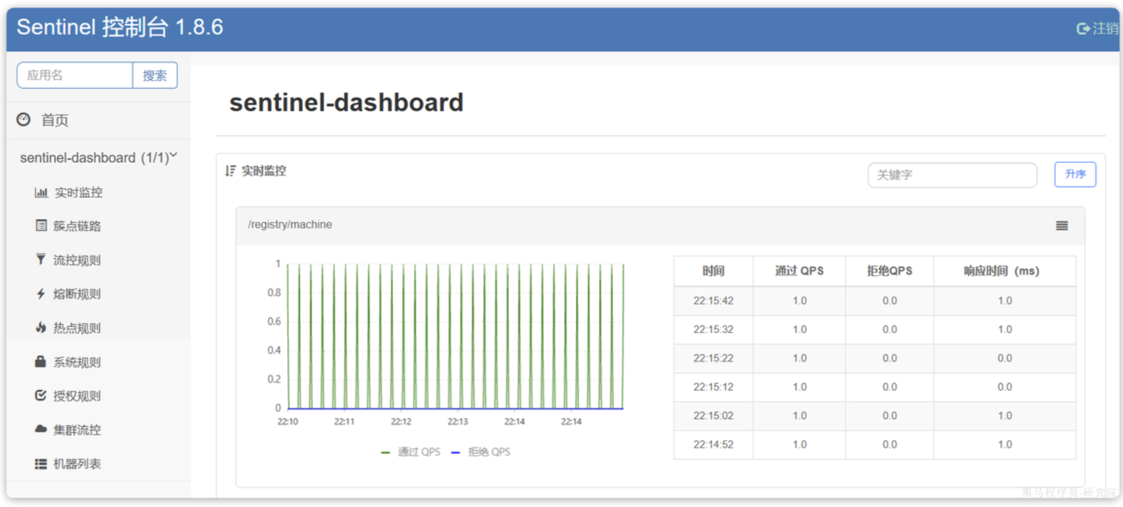登录后,即可看到控制台,默认会监控sentinel-dashboard服务本身: