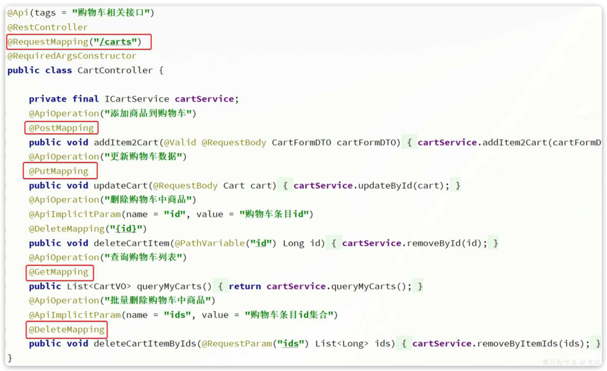 不过,需要注意的是,我们的SpringMVC接口是按照Restful风格设计,因此购物车的查询、删除、修改等接口全部都是/carts路径: