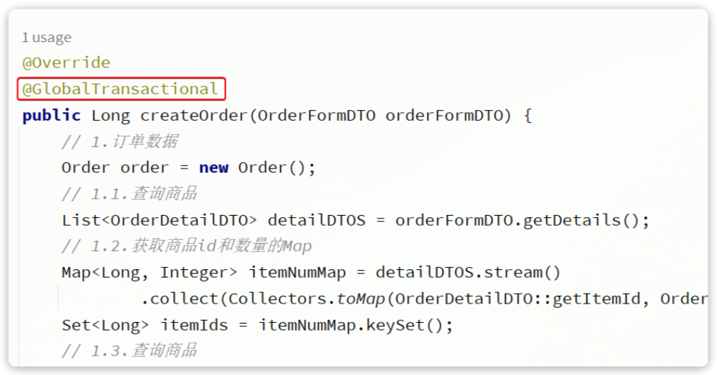 其次,我们要利用@GlobalTransactional标记分布式事务的入口方法: