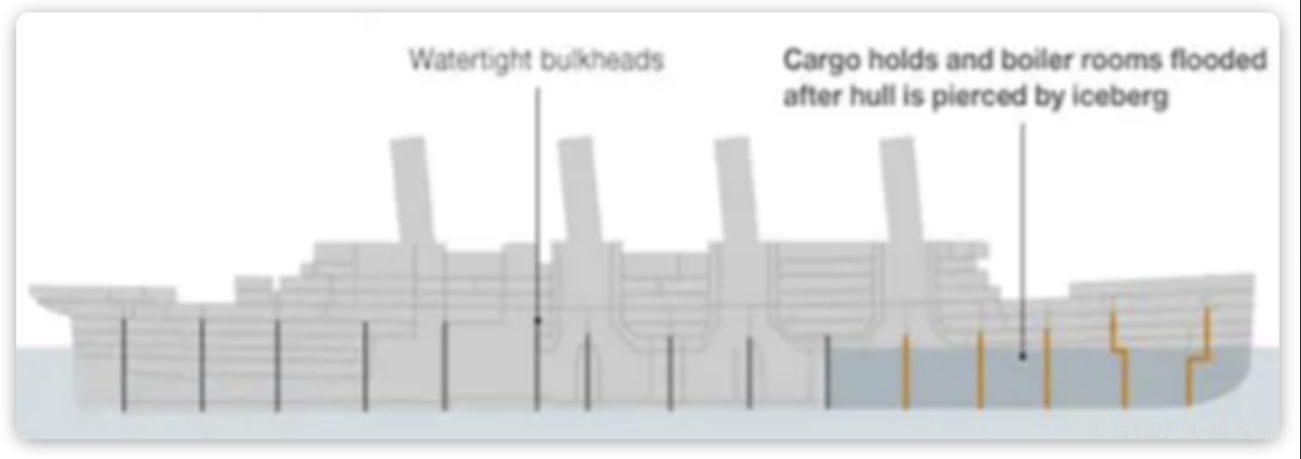 轮船的船舱会被隔板分割为N个相互隔离的密闭舱,假如轮船触礁进水,只有损坏的部分密闭舱会进水,而其他舱由于相互隔离,并不会进水。这样就把进水控制在部分船体,避免了整个船舱进水而沉没。