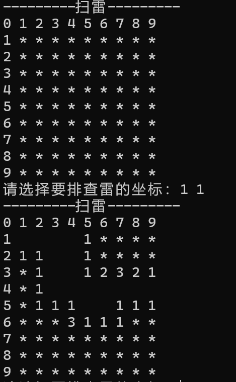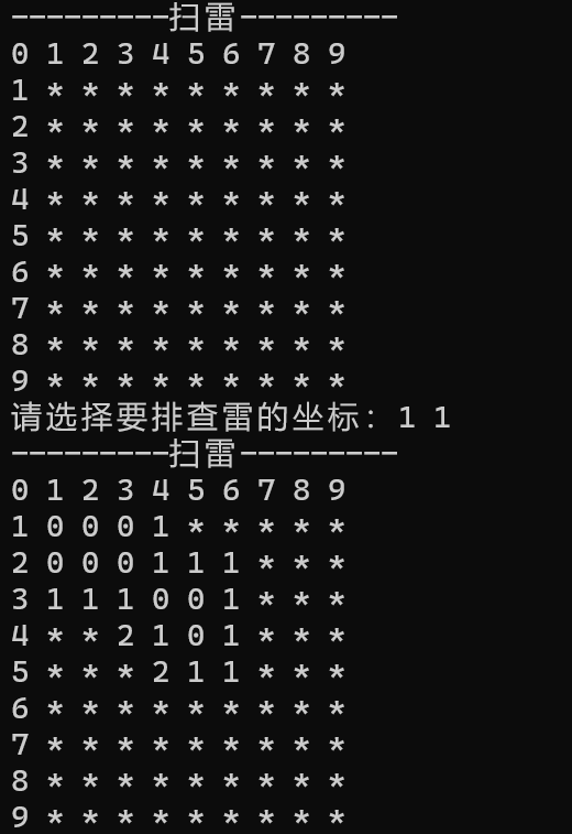 这里我们采用另外一种方案,我们专门给一个棋盘(对应一个数组mine)存放布置好的雷的信息,再给另外一个棋盘(对应另外一个数组show)存放排查出的雷的信息。这样就互不干扰了,把雷布置到mine数组,在mine数组中排查雷,排查出的数据存放在show数组,并且打印show数组的信息给后期排查参考。
