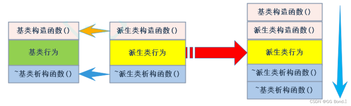 需要注意的是,如果我们提供了任何一个构造函数或析构函数,那么 C++ 编译器就不会再为我们提供默认的构造函数或析构函数了。这时如果我们需要使用默认的构造函数或析构函数,需要我们自己显式地提供。(析构顺序为先派生类再基类)