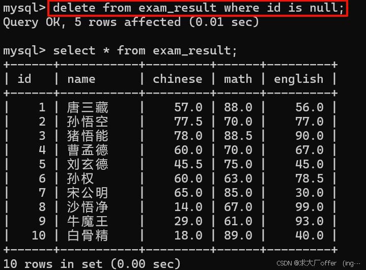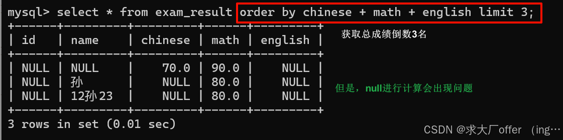 (一)SQL 中,null 是一个特殊值,null 参与运算(加减乘除...)得到的结果还是 null。