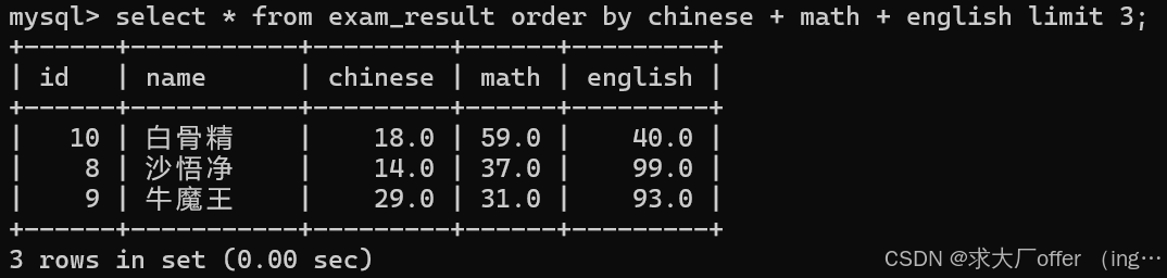 指定 limit 的时候,可以搭配 offset,指定从下标为几 开始查询 limit 条记录(第一条记录的下标从0开始)