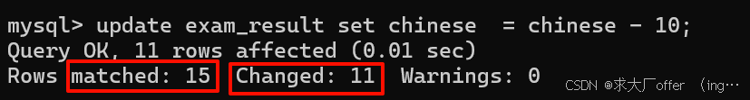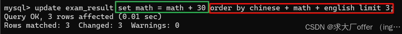 update 表名 set 列名 = 值, 列名 = 值 ..... (where .....) (order by .....) (limit .....):update 真正在改硬盘上的数据,是“持久有效”的,因此 一定要确保 update 是修改对的结果.
