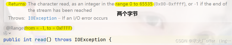 最初按照字节来读,能够看到这里是 utf-8 编码情况,每个汉字应该是3个字节;但使用字符流读取数据时,返回值 char 是两个字节,并非 3 个字节。这是由于 在使用字符流读取数据的过程中,Java标准库内部会自动针对数据的编码进行转码。当使用 char 表示这里的汉字时,不再使用 utf-8,而是使用 unicode 编码(在unicode中,一个汉字 2 个字节)