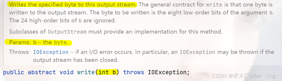 | int | write(byte[] b, int off, int len) | 将b这个字符数组中从 off 开始的数据写入OutputStream中,一共写 len 个 |