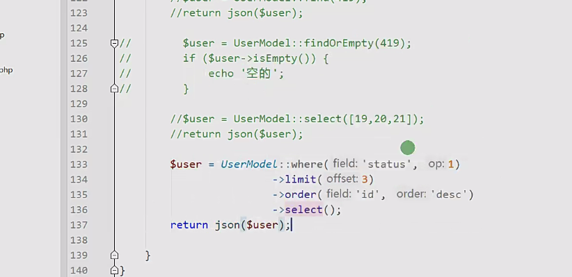 User::where('id',10)->find(); User::where('status',1)->order('id desc')->select(); User::where('status',1)->limit(10)->select();