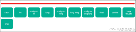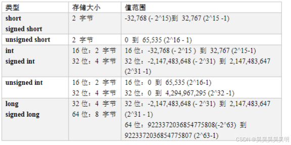 char 类型占 1 个字节,short 类型占 2 个字节,int 类型占 4 个字