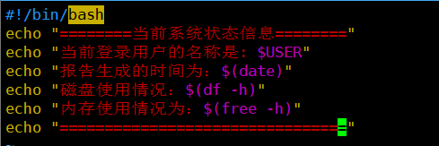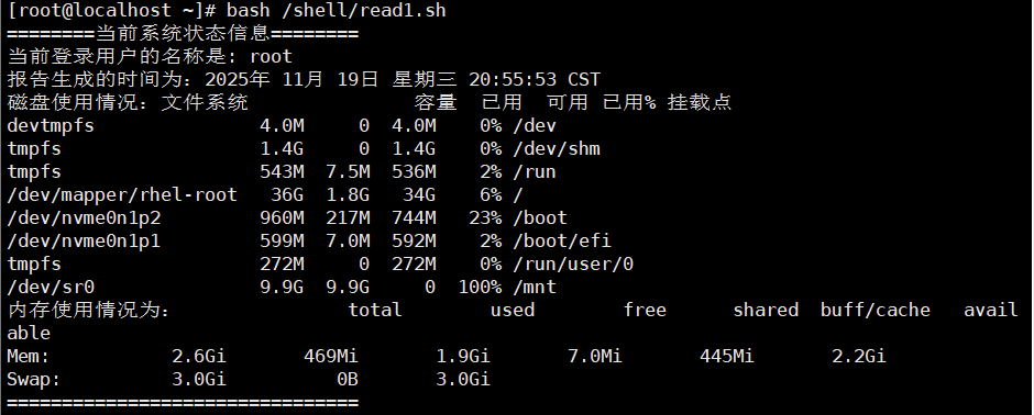 #!/bin/bash # 简单的系统信息报告脚本 # 作者:[您的姓名] # 创建日期:$(date +%Y-%m-%d) # 定义变量 REPORT_TITLE="=== 系统基本信息报告 ===" CURRENT_USER=$(whoami) CURRENT_TIME=$(date) DISK_USAGE=$(df -h /) MEMORY_INFO=$(free -h) # 输出报告 echo $REPORT_TITLE echo "报告生成时间: $CURRENT_TIME" echo "当前用户: $CURRENT_USER" echo "" echo "" echo "磁盘使用情况 (根分区):" echo "$DISK_USAGE" echo "" echo "内存使用情况:" echo "$MEMORY_INFO" echo "" echo "=== 报告结束 ==="