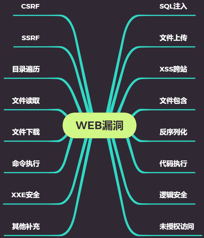 本章节将讲解各种 WEB 层面上的有那些漏洞类型,具体漏洞的危害等级,以简要的影响范围测试进行实例分析,思维导图中的漏洞也是后面我们将要学习到的各个知识点,其中针对漏洞的形成原理,如何发现,如何利用将是本章节学习的重点内容。