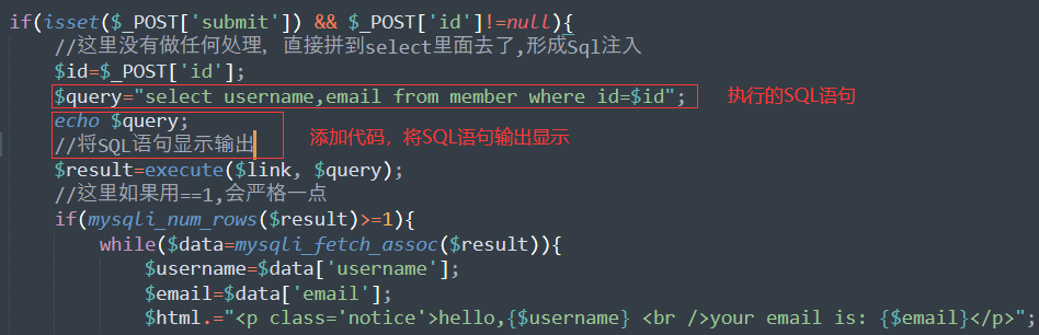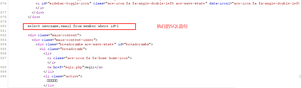 查看源代码,可以看到代码中执行的SQL语句,可以修改代码添加回显