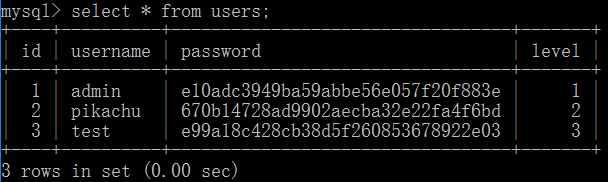 select * from users; 查看users表中所有字段(网站用户账号密码,存在SQL注入的话,可以通过查询这个表获取权限)