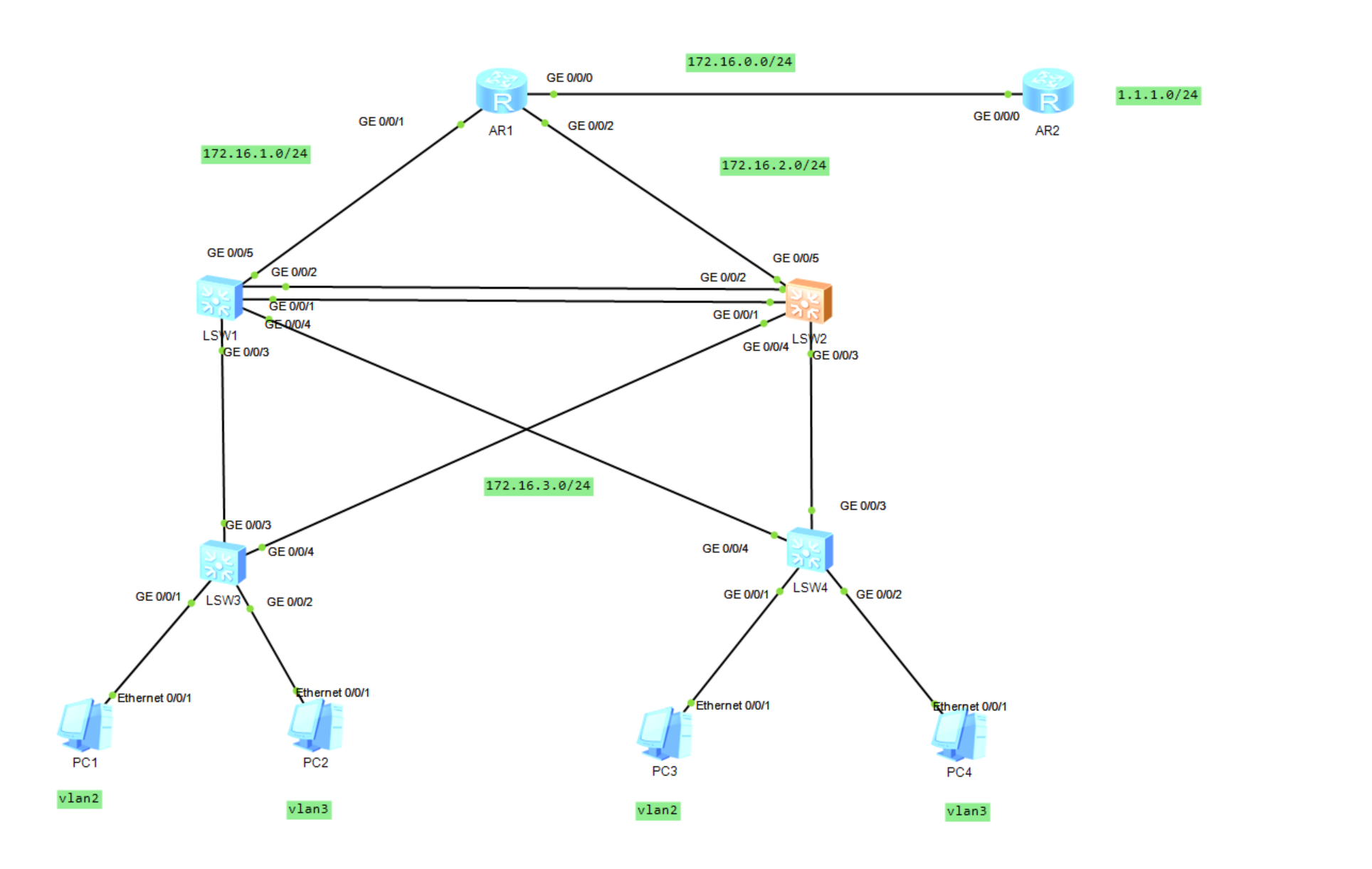 4. SW1为vlan2的主网关设备,vlan3的备份网关设备;SW2反之