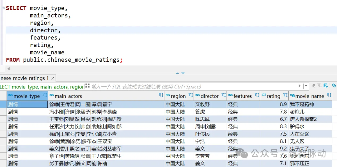 CREATE TABLE public.chinese_movie_ratings ( movie_type varchar(50) NULL, -- 电影类型 main_actors varchar(100) NULL, -- 主演 region varchar(50) NULL, -- 地区 director varchar(50) NULL, -- 导演 features varchar(100) NULL, -- 特色 rating numeric(3, 1) NULL, -- 评分 movie_name varchar(100) NOTNULL, -- 电影名CONSTRAINT chinese_movie_ratings_pk PRIMARY KEY (movie_name));COMMENTONTABLE public.chinese_movie_ratings IS'中国电影评分表';-- Column commentsCOMMENTONCOLUMN public.chinese_movie_ratings.movie_type IS'电影类型';COMMENTONCOLUMN public.chinese_movie_ratings.main_actors IS'主演';COMMENTONCOLUMN public.chinese_movie_ratings.region IS'地区';COMMENTONCOLUMN public.chinese_movie_ratings.director IS'导演';COMMENTONCOLUMN public.chinese_movie_ratings.features IS'特色';COMMENTONCOLUMN public.chinese_movie_ratings.rating IS'评分';COMMENTONCOLUMN public.chinese_movie_ratings.movie_name IS'电影名';