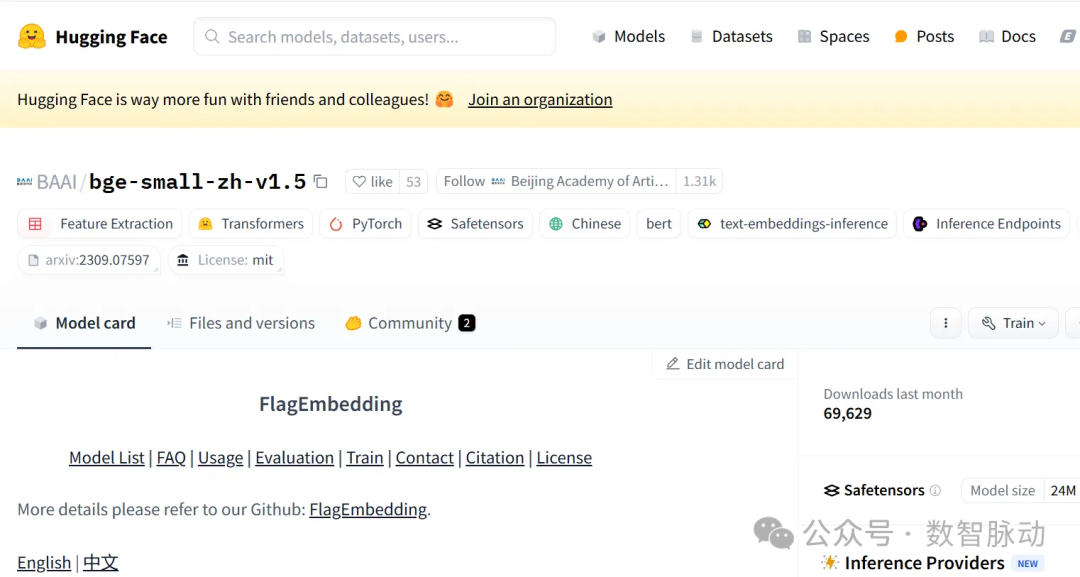 使用 huggingface 上的 BAAI 的嵌入模型。以下两个是轻量级的嵌入模型: