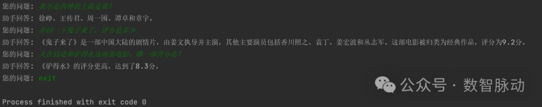 正在创建向量索引…索引创建完成…《我不是药神》的评分是8.9分。知识库已准备就绪!您现在可以询问问题。输入 ‘exit’ 退出。您的问题: 我不是药神的主演是谁?助手回答: 徐峥、王传君、周一围、谭卓和章宇。您的问题: 介绍一下鬼子来了,评分是多少助手回答: 《鬼子来了》是一部中国大陆的剧情片,由姜文执导并主演,其他主要演员包括香川照之、袁丁、姜宏波和丛志军。这部电影被归类为经典作品,评分为9.2分。您的问题: 人在囧途和驴得水这两部电影,哪一部评分高?助手回答: 《驴得水》的评分更高,达到了8.3分。您的问题: exitProcess finished with exit code 0