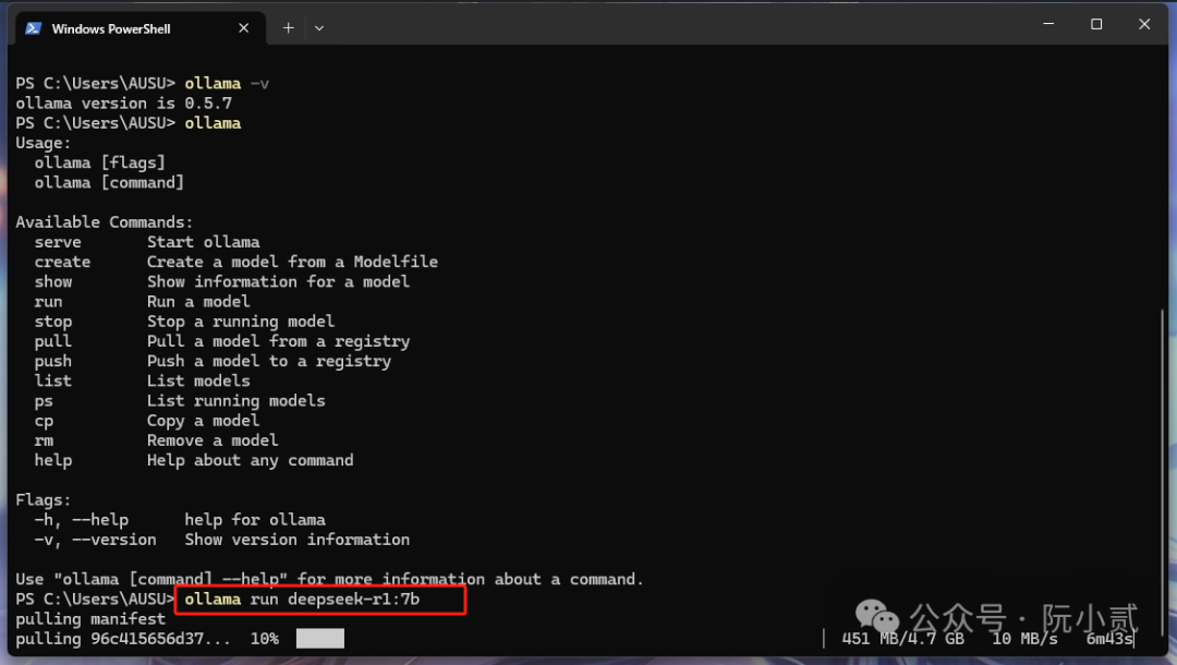 该命令会自动下载并加载模型,下载时间取决于网络速度和模型大小。