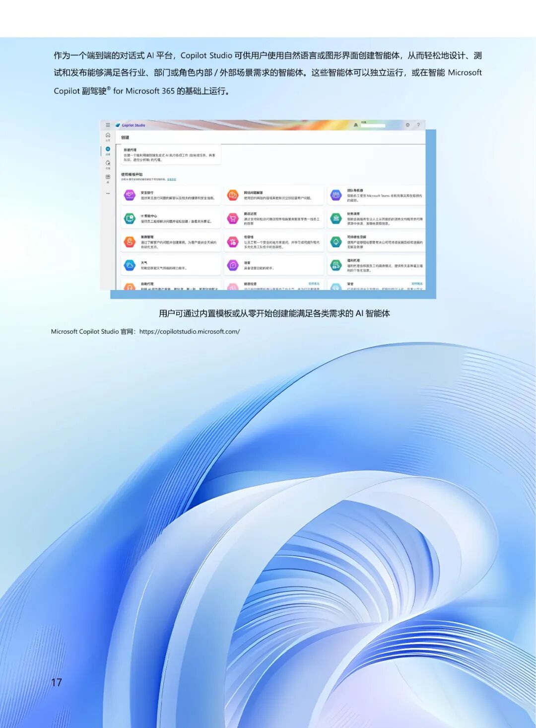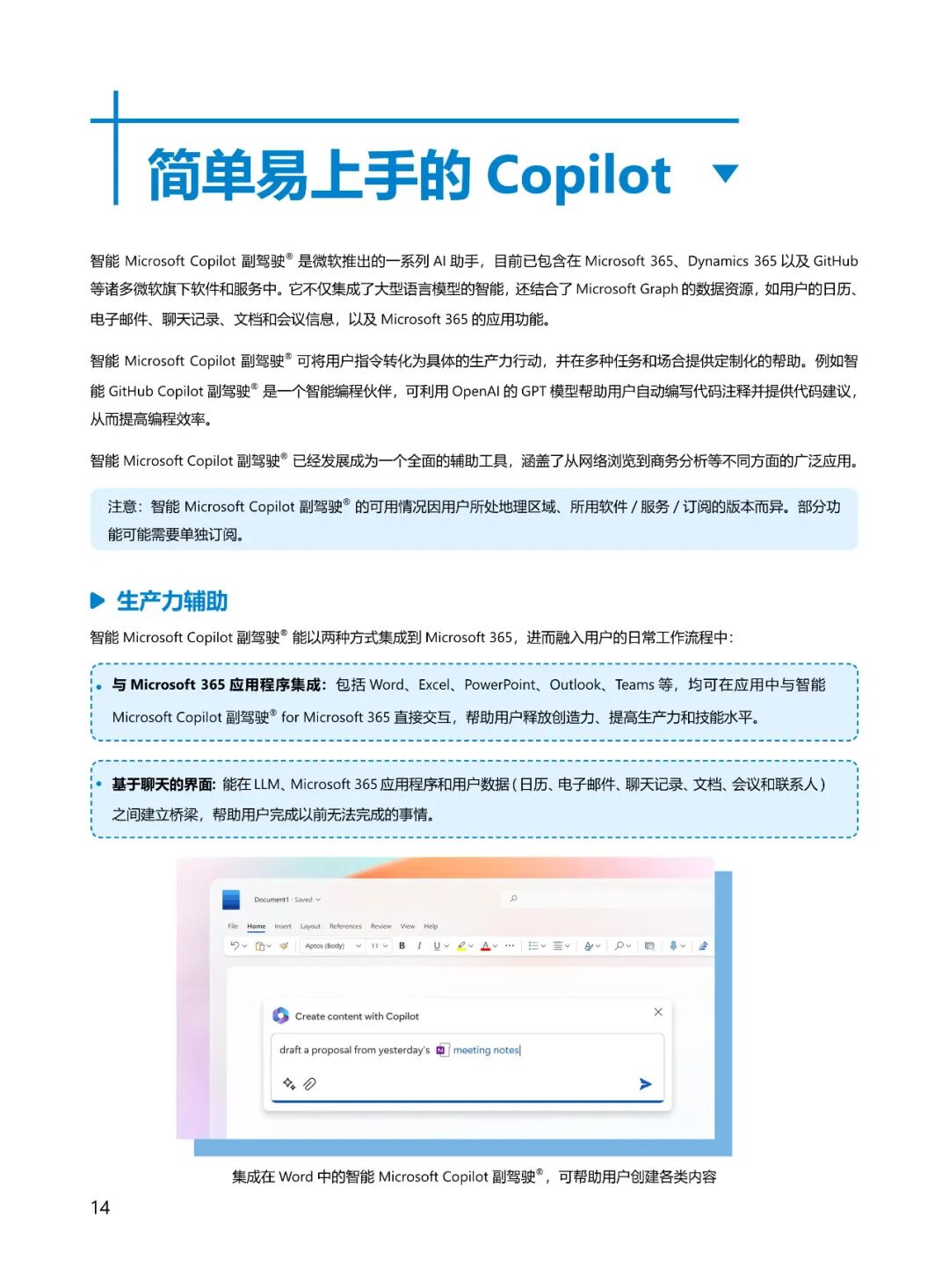 简单易上手的Copilot:智能Microsoft Copilot副驾驶集成LLM智能和Microsoft Graph数据资源,以多种方式集成到Microsoft 365,辅助生产力提升,如在Word等应用中创建内容。它还是创意工具,能创建自定义图像,Copilot Studio可用于开发满足不同需求的智能体 。