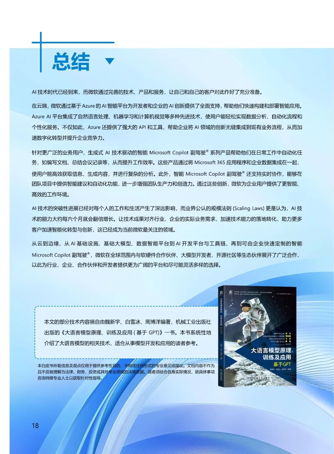 总结:微软借助Azure AI平台支持AI创新,智能Microsoft Copilot副驾驶系列提升工作效率。微软与各方展开合作,推动AI技术成果落地,助力企业智能化转型 。