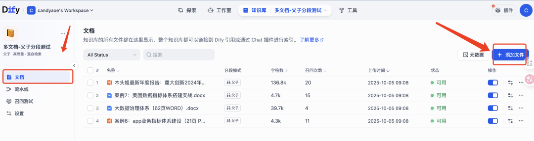 但是,这个时候还不能使用这个知识库,我们需要到“文档”界面,通过“添加文件”,完成解析知识后,才可以在工作流中,配置该知识库。
