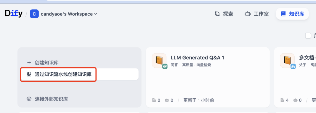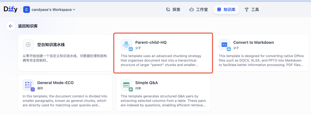 我这次配置的 pipeline 用的是 Dify 内置的模板,选择知识库->通过知识库流水线创建知识库->Parent-child-HQ