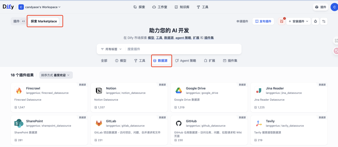◦ 数据源突破: 引入了全新的 Data Source 插件类型,用户通过 Marketplace 插件即可一键接入主流数据源(如 Google Drive, Notion, Firecrawl 等),无需为每种数据源编写定制代码并维护认证逻辑。