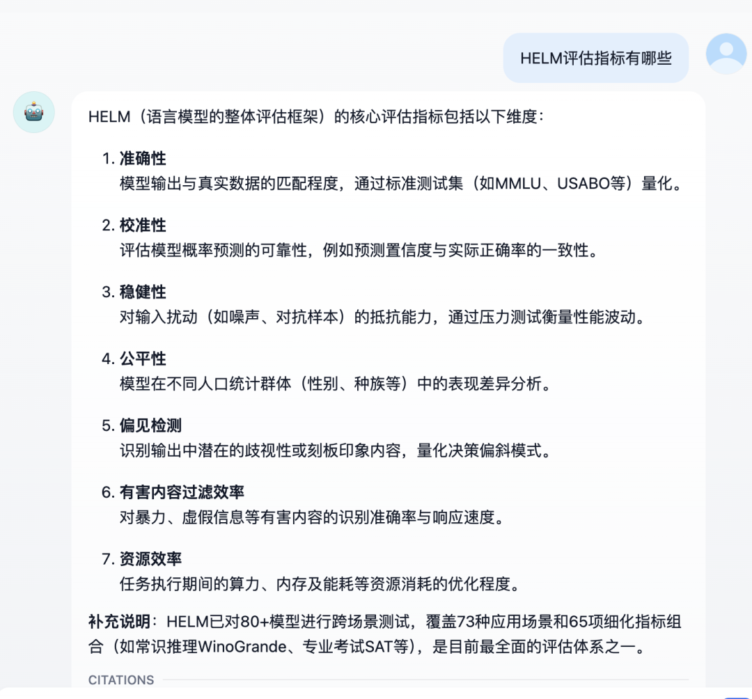 回答:可以看到,右侧的 HELM 评估指标,完整的得到识别和回答。