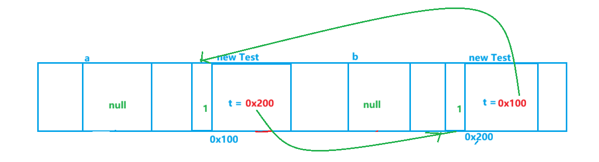 class Test{ Test t = null; } Test a = new Test(); Test b = new Test(); a.t = b; b.t = a; a = null; b = null;