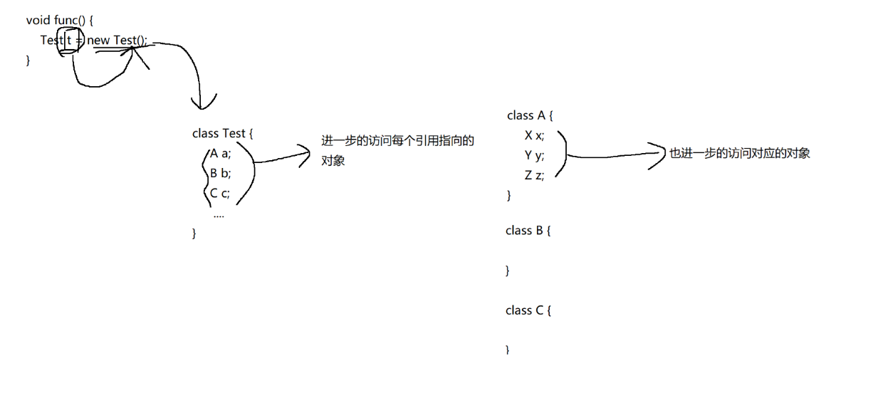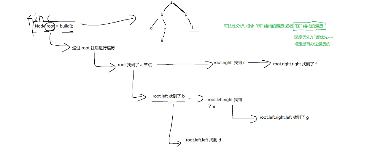 class Node{ String val; Node left; Node right; } Node build(){ Node a = new Node("a"); Node b = new Node("b"); Node c = new Node("c"); Node d = new Node("d"); Node e = new Node("e"); Node f = new Node("f"); Node g = new Node("g"); a.left = b; a.right = c; b.left = d; b.right = e; e.left = g; c.rihgt = f; reture a; } fun(){ Node root = bulid(); }以root为起点,进入build()内部进行对象遍历(深度优先/广度优先~),判定每一个对象的可达性