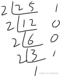 如图所示,这里用辗转相除法求十进制下25的二进制数,连上最后一位的商,从下往上取余数即可得到25的二进制形式为:11001