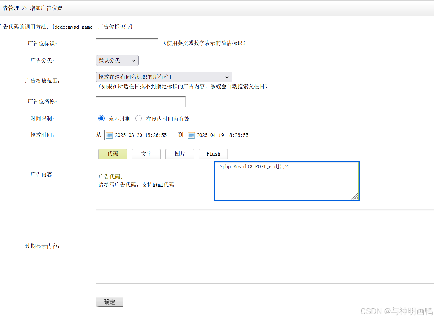填写广告标识--广告内容填写一句话木马--确定