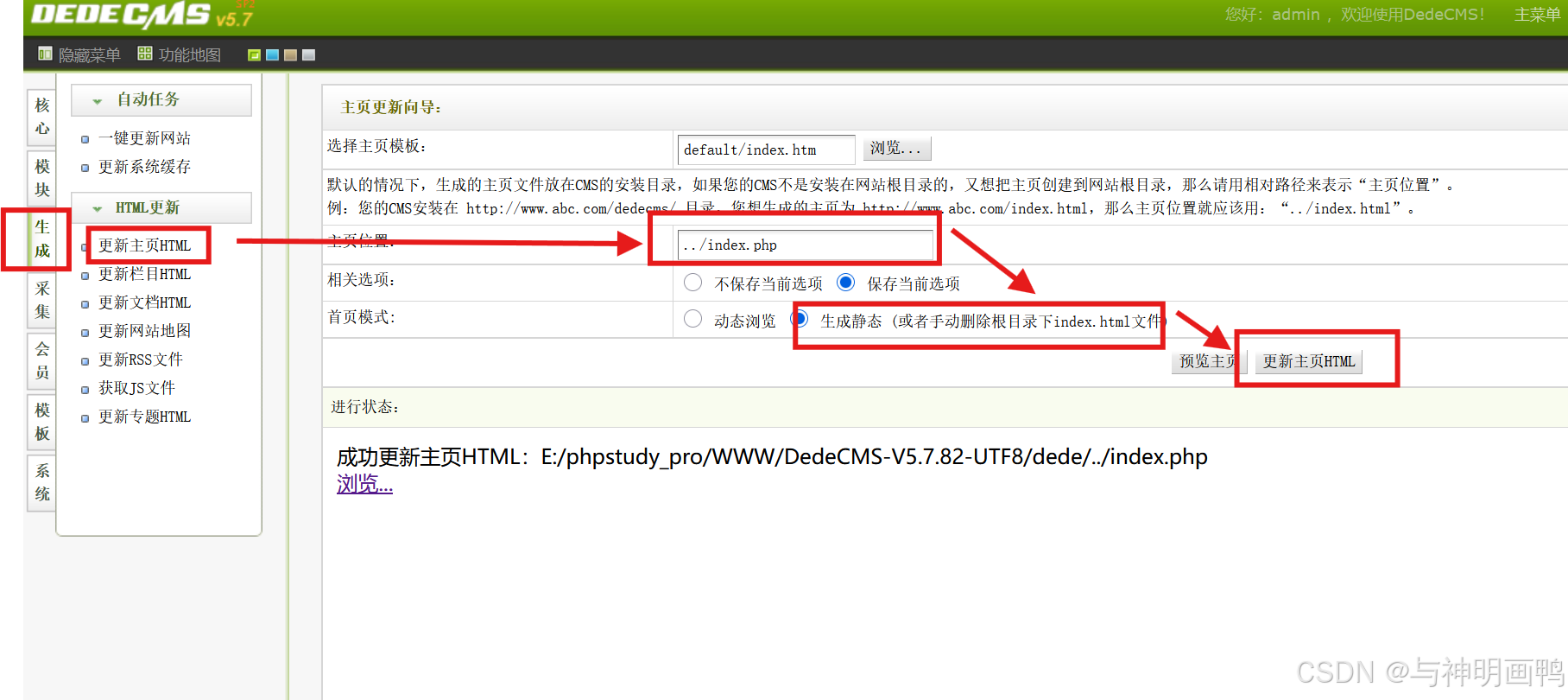 依次点击生成--更新主页--位置由index.htm改为index,php--生成静态--更新主页