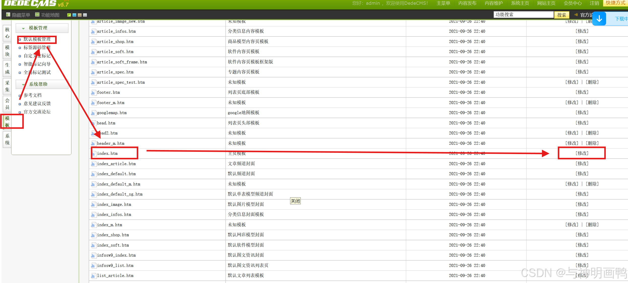 依次点击,模板--默认模板管理--index.htm--修改